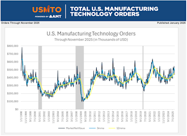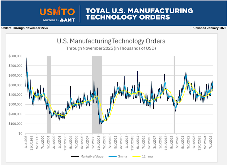 McLean, Va. (January 12, 2026) — New orders of metalworking machinery, measured by the U.S. Manufacturing Technology Orders Report published by AMT – The Association For Manufacturing Technology, totaled $437.9 million in November 2025. This represented a 19.6% decrease from October 2025 and nearly equaled the orders in November 2024, with a difference of just over $2 million. Machinery orders tracked by USMTO through November 2025 totaled $4.92 billion, a 17.8% increase over the first 11 months of 2024.