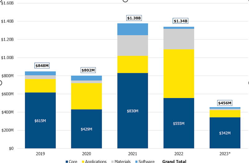 Venture Capital Investments. Each venture capital investment can be sorted into four AMT-defined categories: core technology, applications, software, and materials. Core technology, the investments that represent AM process development, have remained the primary focus for venture capital investment over the last five years. The year 2022 saw investments in 3D printing applications reach $536 million, three times the amount from 2021.