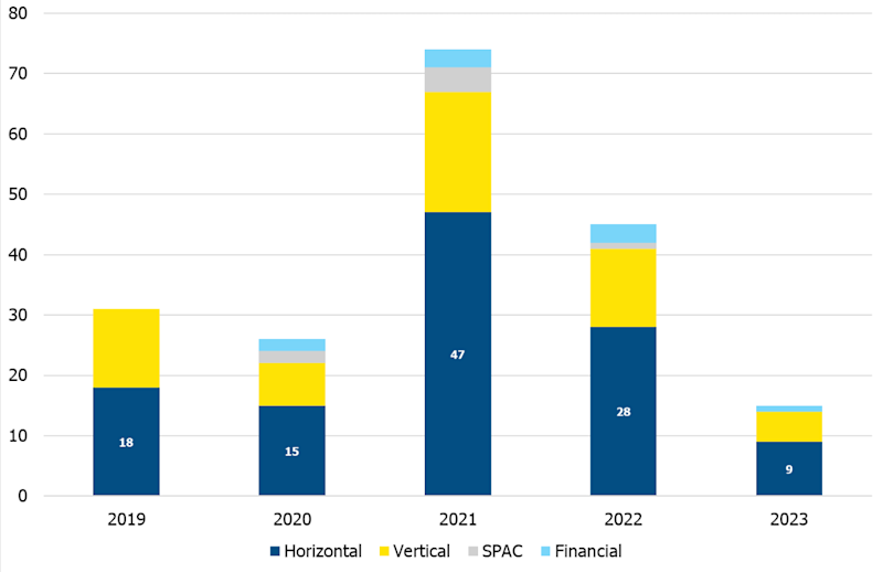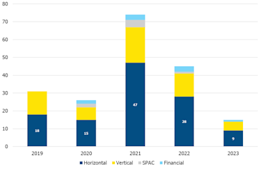 AM Mergers and Acquisitions. Acquisitions can be categorized into four types of transactions: horizontal or vertical by relative position in the supply chain, special purpose acquisition company (SPAC), and financial. Horizontal and vertical transactions are strategic by nature and continue to represent most transactions in AM each year. When looking at the number of transactions by year, we can see that in 2021, many transactions that were delayed due to COVID-19 in 2020 went through and were finalized in 2021. The year 2022 represented a “return to the norm” for the industry, with 2023 showing a slower year for merger and acquisition (M&A) activity. We currently project there to be about 20 deals announced by year-end.