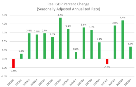 In the fourth quarter of 2025, U.S. GDP grew at a 1.4% real annualized rate after declines in government spending, exports, and consumer spending.