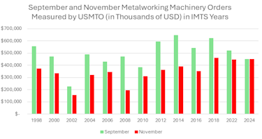 September generally marks the high point of the year for orders of manufacturing technology, particularly in Septembers of even-numbered years, when IMTS opens its doors. Since 2016, however, the decline in orders in the following months has gotten noticeably shallower. In IMTS years, September orders average 47% higher compared to the following November, but in 2024, September orders were a mere 0.2% higher. Check out the latest USMTO article to learn how changing buying patterns may have caused this unexpectedly robust November. Read more.