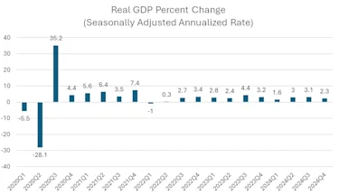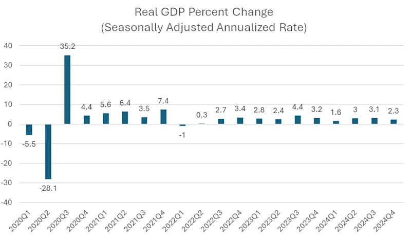 Last week had two big economic announcements that signaled the continued strength of the U.S. economy. On Wednesday, the Federal Reserve held ratessteady for the first time since they began cutting in September 2024, citing strong labor markets and dwindling inflation as evidence the economy is on the desired path. That view was bolstered on Thursday, when the Bureau of Economic Analysis estimated U.S. GDP grew by 2.3% in the fourth quarter of 2024, below the consensus forecast but well above the Fed’s long-run growth projection of 1.8% per year.
