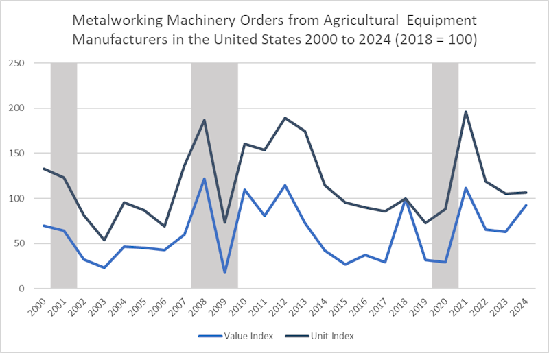 In 2021, after years of declining investment, manufacturers of agricultural equipment began to increase their orders of metalworking machinery. In 2024, order values continued to rise, but the number of units flattened. Through July of this year, investments declined dramatically. Could planned investments from major OEMs reverse the trend in 2026?