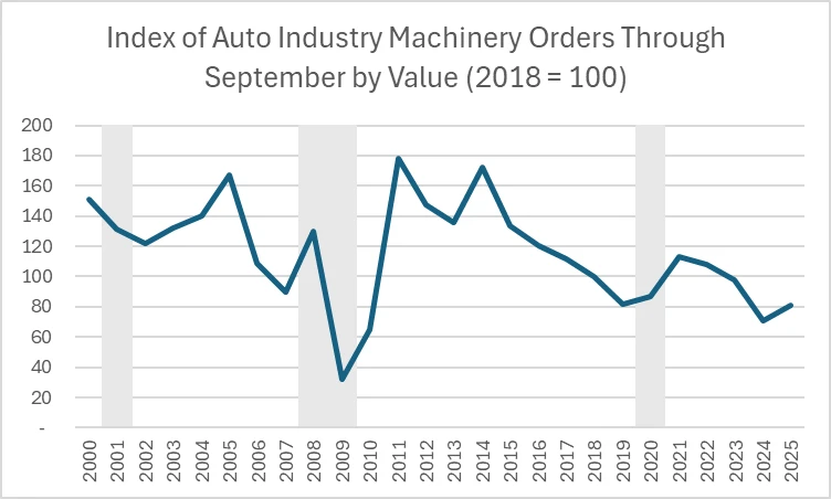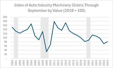 Despite orders declining after the 2008 financial crisis, the automotive sector remains a major customer for manufacturing technology. Through the first three quarters of 2025, orders are 14.7% higher than those in the same period of 2024. Will changing consumer preferences and production trends keep this industry in the driver’s seat?
