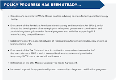 Our work continues. Although there have been significant achievements since the release of the Mandate over a decade ago, there are still barriers preventing innovation, a level playing field, and making a dent in the skills gap. Our 2021 advocacy goals include making the bonus depreciation provisions permanent, preserving the lower tax rates enacted in the 2017 Tax Cut and Jobs Act, ensuring resilient supply chains, easing U.S.-China trade tensions while protecting U.S. business interests, incentivizing the adoption of transformational technologies, and building a Smartforce educated and trained on those technologies.