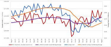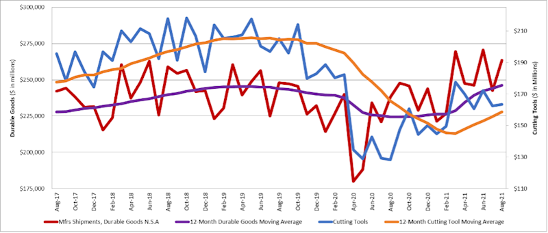 The graph below includes the 12-month moving average for the durable goods shipments and cutting tool orders. These values are calculated by taking the average of the most recent 12 months and plotting them over time.