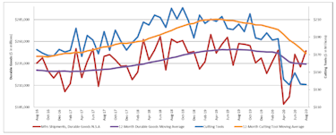 The graph below includes the 12-month moving average for the durable goods shipments and cutting tool orders. These values are calculated by taking the average of the most recent 12 months and plotting them over time.