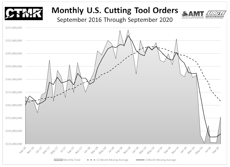 September 2020 U.S. cutting tool consumption totaled $156.1 million, according to the U.S. Cutting Tool Institute (USCTI) and AMT – The Association For Manufacturing Technology. This total, as reported by companies participating in the Cutting Tool Market Report collaboration, was up 14.7 percent from August's $136.1 million and down 20.5 percent when compared with the $196.3 million reported for September 2019. With a year-to-date total of $1.4 billion, 2020 is down 23.1 percent when compared with September 2019.