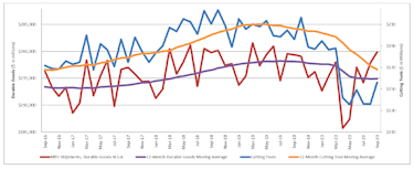 The graph below includes the 12-month moving average for the durable goods shipments and cutting tool orders. These values are calculated by taking the average of the most recent 12 months and plotting them over time.