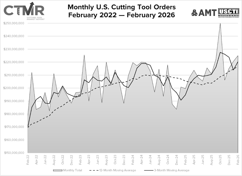 McLean, Va. (April 14, 2026) — Shipments of cutting tools, measured by the Cutting Tool Market Report, a collaboration between AMT – The Association For Manufacturing Technology and the U.S. Cutting Tool Institute (USCTI), totaled $225.1 million in February 2026. Orders increased 2% from January 2026 and were up 12.8% from February 2025. Year-to-date shipments totaled $445.8 million, up 11.3% from the same period in 2025. The number of units shipped also increased slightly from January. “The first quarter of 2026 looks a bit better from a sales perspective,” said Mike Stokey, president of USCTI and executive vice president and owner of Allied Machine & Engineering, a cutting tool manufacturer. “Unfortunately, there continues to be uncertainty regarding the cost and supply of raw materials. The leadership and membership of USCTI are keeping a close eye on this issue. These factors, along with the war in the Middle East, are requiring constant attention from our entire industry.” Michelle Kocses, senior economist at ITR Economics, said, “The year is off to a strong start, with cutting tool orders up double digits from the start of 2025. Higher demand is supported by rising industrial activity. Construction machinery, defense, and aerospace markets are leading the growth. Laggards include the heavy truck, light vehicle, and medical equipment markets. Organic market growth will likely drive top lines higher, but it is important to focus on efficiency given multifaceted cost pressures.”