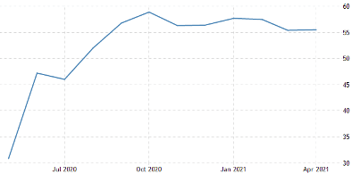 April saw a dramatic surge in COVID-19 as cases per day surpassed 200,000, adding to the more than 20 million reported cases since the beginning of the pandemic. Yet, the manufacturing purchasing managers’ index (PMI) for April remained strong at 55.5, beating market consensus of 51.6 and indicating a solid improvement in the health of the sector. At the same time, according to Markit Economics, new export orders surged to the fastest pace since last October, and buying levels expanded at one of the sharpest rates in nine years.