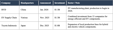 Trade and FDI: Supply chain diversification continues to drive export growth. Southeast Asia remains highly competitive for foreign capital in manufacturing, AI infrastructure, and green technology sectors.