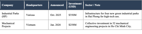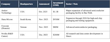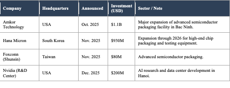 Semiconductor “Silicon Belt” Forming: Investment is concentrating in the Northern corridor (Bac Ninh, Thai Nguyen, Bac Giang), which is rapidly becoming the regional hub for electronics and semiconductor logistics.