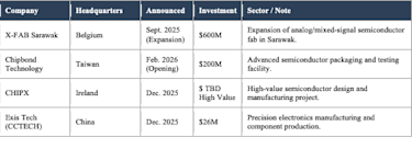 Malaysia’s semiconductor clusters saw meaningful capacity expansions, backed by new tooling investments from domestic and foreign players alike.