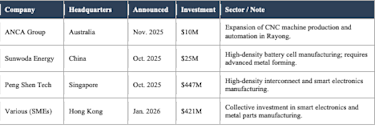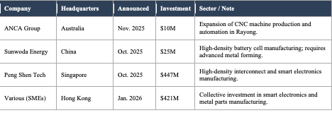 Strategic capital flowed into manufacturing infrastructure upgrades across the region – spanning power solutions, industrial automation, and high-precision manufacturing facilities. The pattern is unmistakable: Investors are not just building factories in Southeast Asia; they’re building the next generation of them.