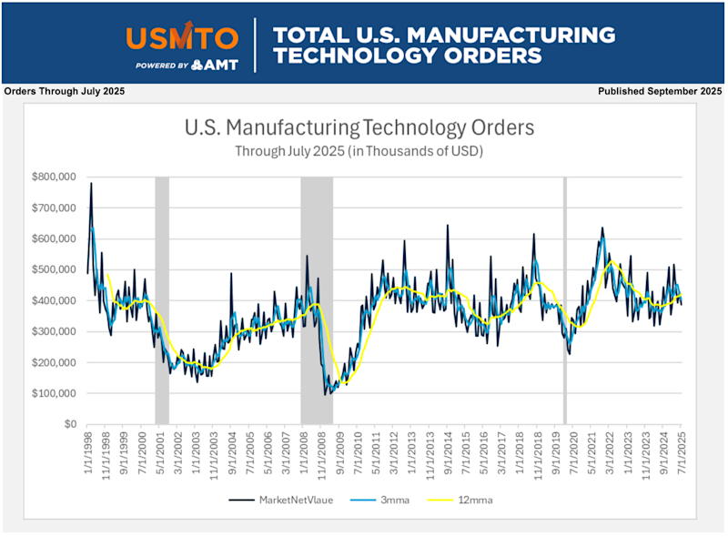McLean, Va. (September 8, 2025) — New orders of metalworking machinery, measured by the U.S. Manufacturing Technology Orders Report published by AMT – The Association For Manufacturing Technology, totaled $387.3 million in July 2025. This was a 9.5% decrease from June 2025 but a 20.1% increase from July 2024. Machinery orders placed through July 2025 totaled $2.91 billion, a 14.4% increase over the first seven months of 2024.
