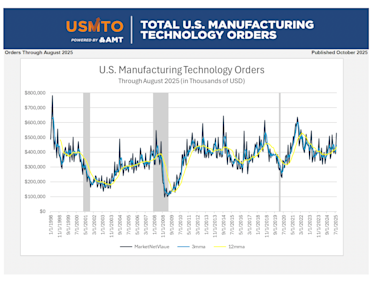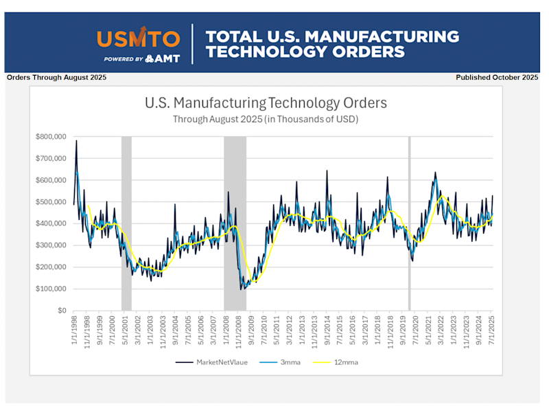 McLean, Va. (October 13, 2025) — New orders of metalworking machinery, measured by the U.S. Manufacturing Technology Orders Report published by AMT – The Association For Manufacturing Technology, totaled $529.4 million in August 2025. This was a 36.2% increase from July 2025 and nearly a 45% increase from August 2024. Machinery orders placed through August 2025 totaled $3.44 billion, an 18.3% increase over the first eight months of 2024.