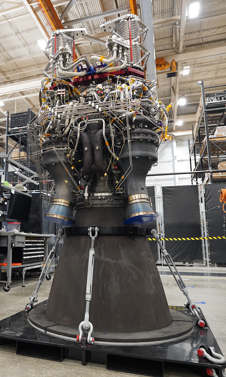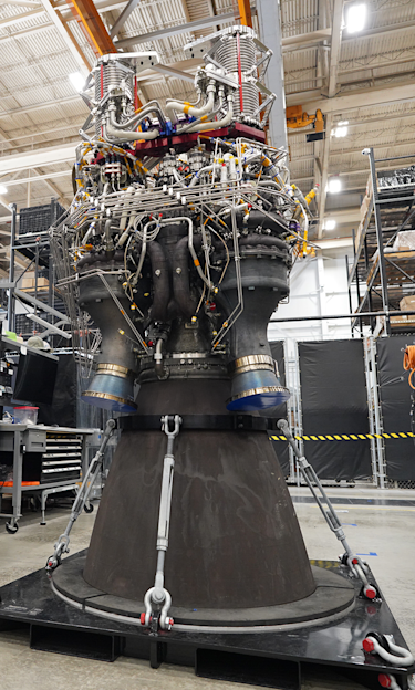 Many of the component parts for the Aeon R rocket engine were 3D printed by Relativity Space in Long Beach, California. Stage 1 of the Terran R spacecraft will use 13 of these engines. (Image: Relativity Space)