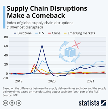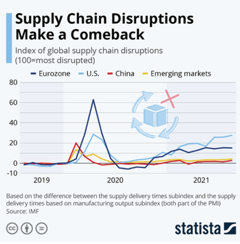 Supply chain stories have led the news for weeks as freighters pile up off the coast of China or the United States. Inventories are skyrocketing as manufacturers order in excess to anticipate shortages. Walmart has begun to hire its own freighters. Job shops are requiring their customers supply materials. The United States is suffering a little more in this issue than other nations.