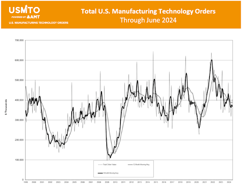 McLean, Va. (August 12, 2024) — Orders of manufacturing technology, measured by the U.S. Manufacturing Technology Orders (USMTO) report published by AMT – The Association For Manufacturing Technology, totaled $402.3 million in June 2024. New orders of metalworking machinery were up 4.3% from May 2024 but down 1.6% from June 2023. Year-to-date orders reached $2.2 billion, down 10.7% compared to the first half of 2023.