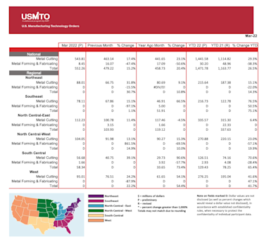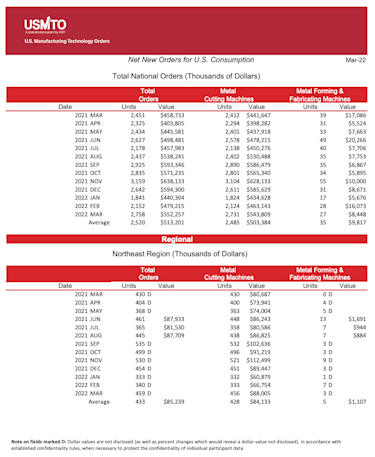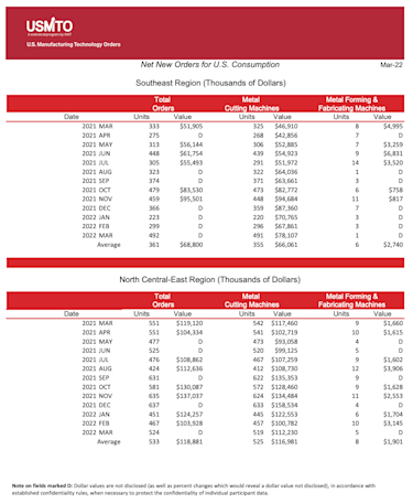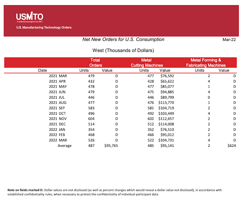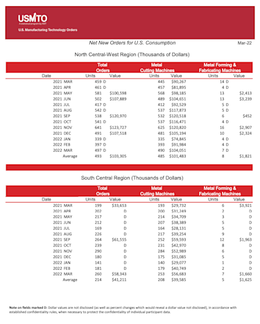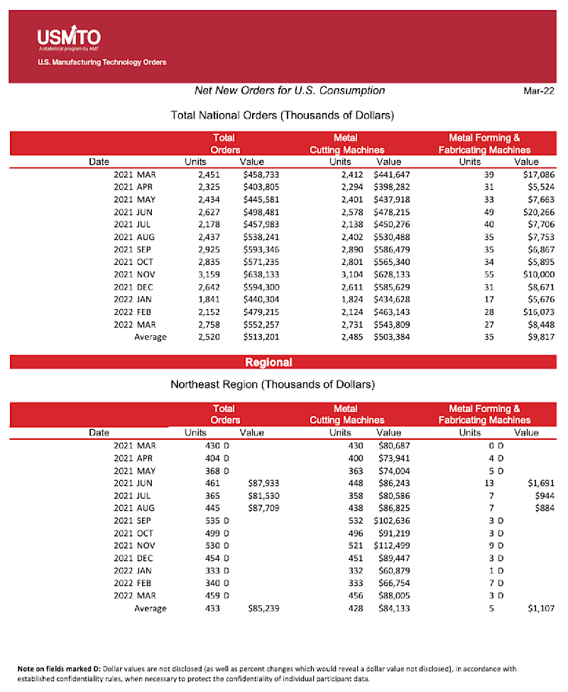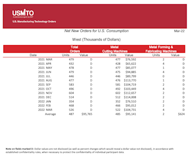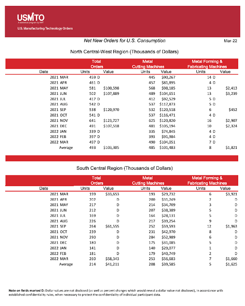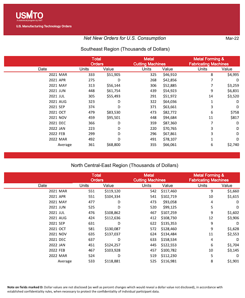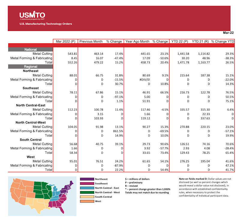 The United States Manufacturing Technology Orders (USMTO) Report is based on the totals of actual data reported by companies participating in the USMTO program. This report, compiled by AMT – The Association For Manufacturing Technology, provides regional and national U.S. orders data of domestic and imported machine tools and related equipment. Analysis of manufacturing technology orders provides a reliable leading economic indicator as manufacturing industries invest in capital metalworking equipment to increase capacity and improve productivity.