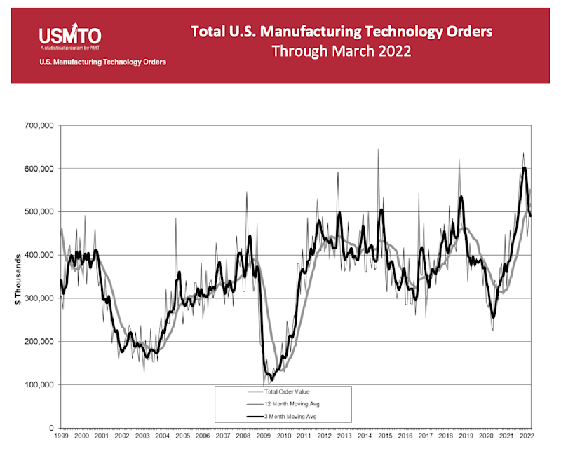 McLean, Va. (May 9, 2022) – Monthly orders of manufacturing technology surpassed half a billion dollars for the first time in 2022, totaling $552.3 million in March, according to the latest U.S. Manufacturing Technology Orders Report published by AMT – The Association For Manufacturing Technology. March 2022 orders were 15.2% higher than February 2022 orders and 20.4% higher than March 2021. The first quarter of 2022 had orders totaling $1.47 billion, 26.5% higher than the first quarter of 2021 and the highest Q1 of any year since 1998.