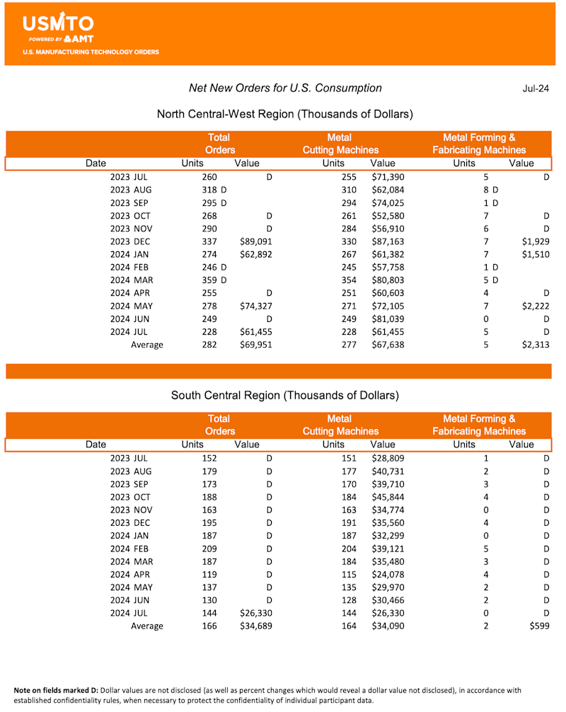 The United States Manufacturing Technology Orders (USMTO) Report is based on the totals of actual data reported by companies participating in the USMTO program. This report, compiled by AMT – The Association For Manufacturing Technology, provides regional and national U.S. orders data of domestic and imported machine tools and related equipment. Analysis of manufacturing technology orders provides a reliable leading economic indicator as manufacturing industries invest in capital metalworking equipment to increase capacity and improve productivity. USMTO.com.