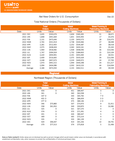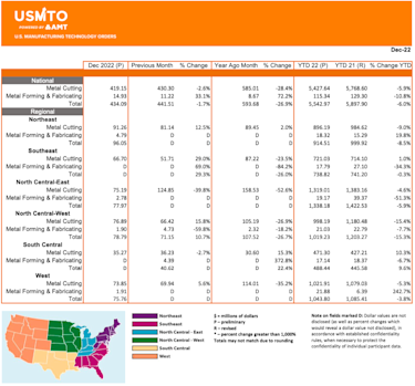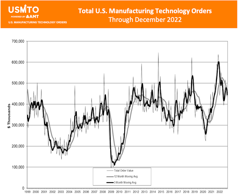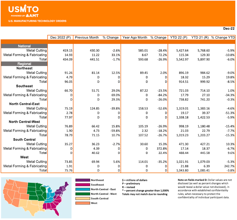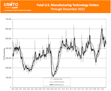 McLean, Va. (February 13, 2023) – New orders of manufacturing technology totaled $434.1 million in December 2022, according to the latest U.S. Manufacturing Technology Orders Report published by AMT – The Association For Manufacturing Technology. December 2022 orders were down 1.7% from November 2022 and down 27% from December 2021. Total orders for all of 2022 came to $5.54 billion, a 6% decrease from total orders in 2021.