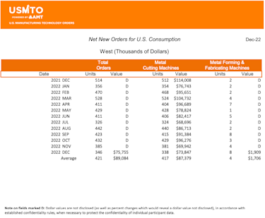 “Of the 27 customer industries tracked by USMTO, the number who are underperforming 2019 could almost be counted on a single hand,” said McGibbon. “Over the last two years, we have been pointing out potential hurdles that could upend the historic run of order activity. Each time, the industry responded by taking in more orders than expected, which is a testament to the health of the United States manufacturing sector and a great way to begin 2023.”