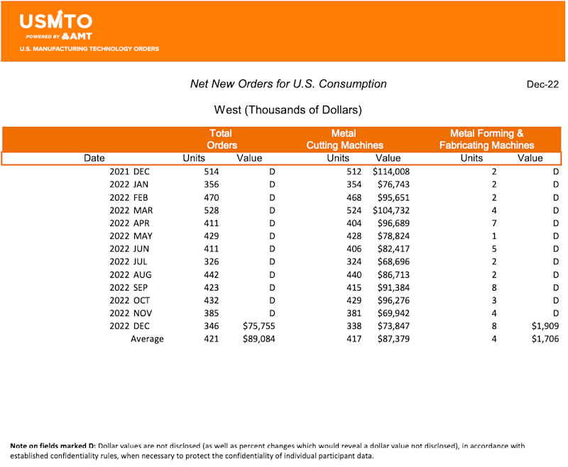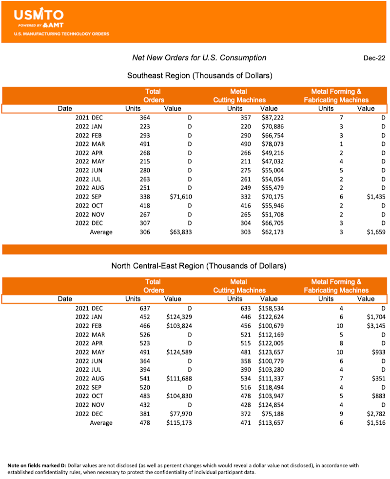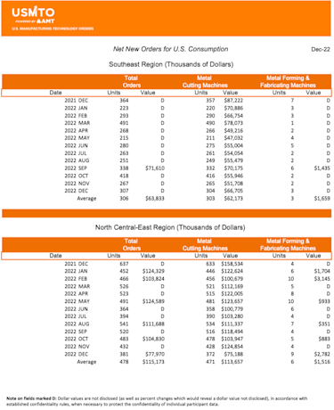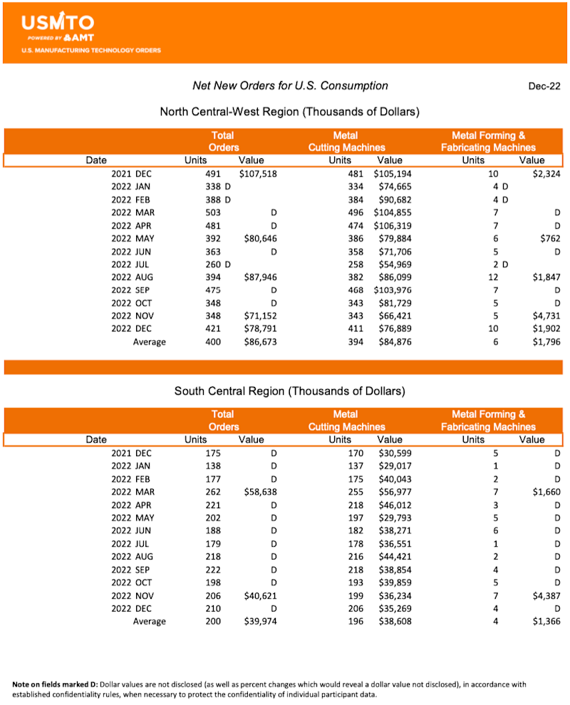 The United States Manufacturing Technology Orders (USMTO) Report is based on the totals of actual data reported by companies participating in the USMTO program. This report, compiled by AMT – The Association For Manufacturing Technology, provides regional and national U.S. orders data of domestic and imported machine tools and related equipment. Analysis of manufacturing technology orders provides a reliable leading economic indicator as manufacturing industries invest in capital metalworking equipment to increase capacity and improve productivity.