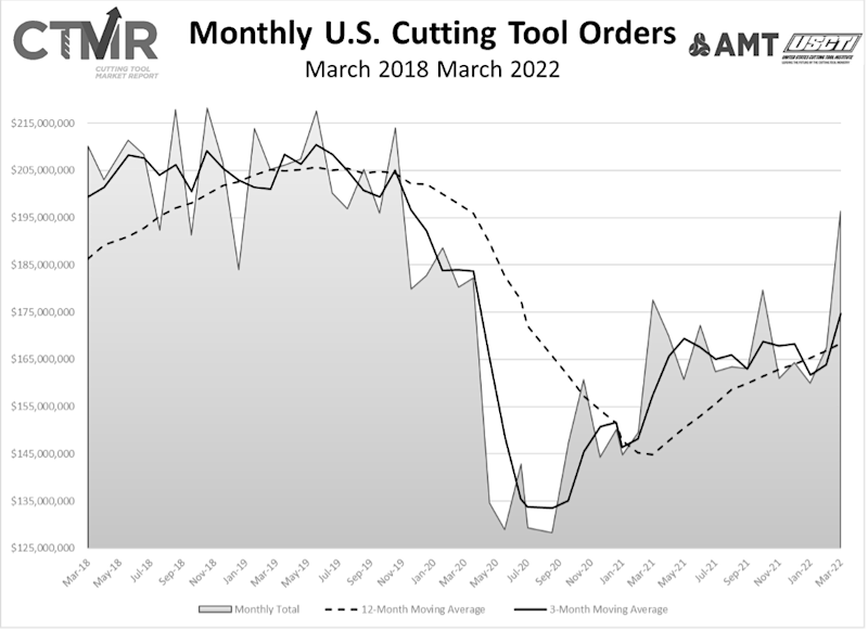 Alan Richter, editor-at-large of Cutting Tool Engineering, also commented on inflation, saying, “While challenges to the metal cutting sector remain, it's encouraging to see that the dollar total for U.S. cutting tool orders in March 2022 is at a level not seen since prior to the pandemic, in October 2019. Some of that is the result of inflation, as the cost of carbide and other tool materials increase along with the price to produce and transport tools, but cutting tool consumption looks likely to continue to rise throughout the year as manufacturers continue to ship more durable goods. I'm looking forward to experiencing a lot of positive energy at IMTS in September.”