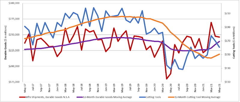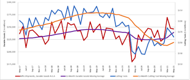 The graph below includes the 12-month moving average for the durable goods shipments and cutting tool orders. These values are calculated by taking the average of the most recent 12 months and plotting them over time.