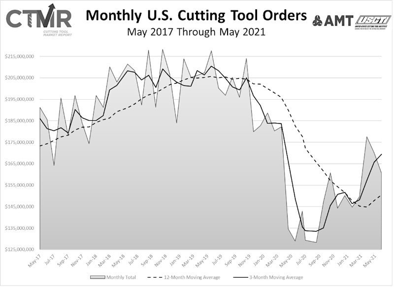 McLean, Va., (July 15, 2021) – May 2021 U.S. cutting tool consumption totaled $160.7 million, according to the U.S. Cutting Tool Institute (USCTI) and AMT – The Association For Manufacturing Technology. This total, as reported by companies participating in the Cutting Tool Market Report collaboration, was down 5.5% from April's $170 million and up 24.6% when compared with the $129 million reported for May 2020. With a year-to-date total of $802.6 million, 2021 is down 1.5% when compared to May 2020.