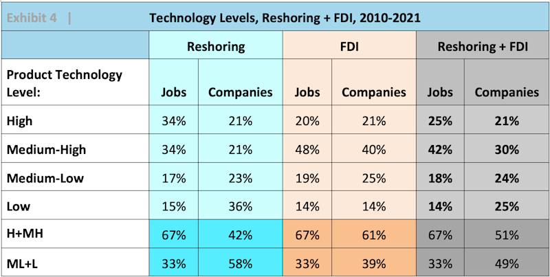 Reshoring and FDI continue to add more high-tech jobs than low-tech, again driven by the essential products push. This trend is important since the U.S. has a trade deficit in high-tech products. Reshoring is stronger in high-tech than FDI, which is stronger in medium-high-tech due to the high percentage of transportation equipment in FDI. The higher tech companies average more employees per company than do the lower tech companies. I think the U.S. needs to be competitive on all tech levels to balance the trade deficit and employ a broader range of workers. One challenge is to upskill our workforce to work on more highly automated production of lower tech products.