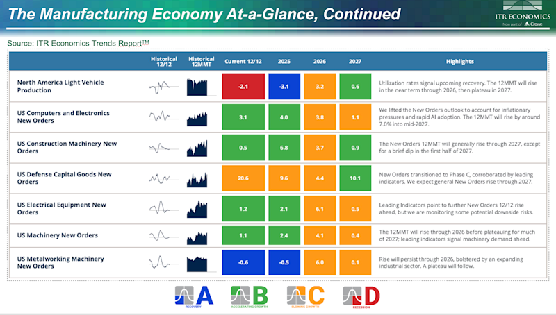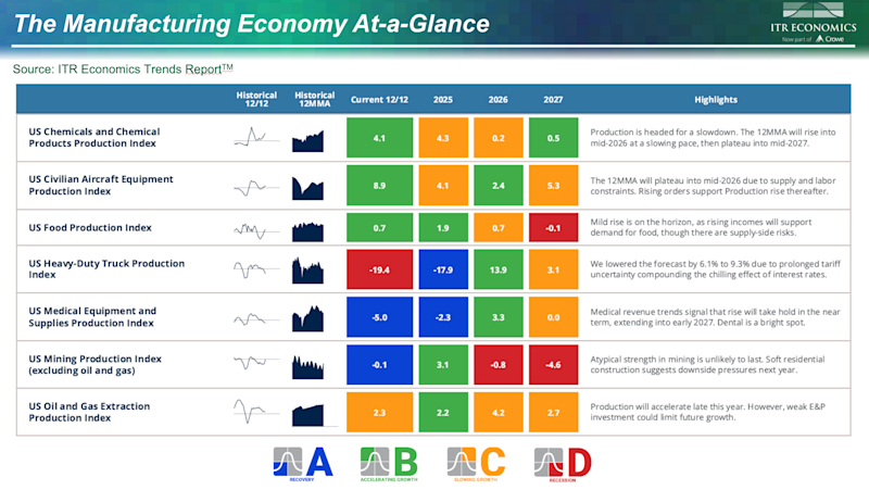 The automotive market appears to be stabilizing, but there is a long-term threat to U.S. OEMs from low-cost Chinese manufacturers. Meanwhile, aerospace and defense markets remain a bright spot as commercial air travel and jet demand are strong, coupled with rising global defense spending. Construction spending is buoyed by strong investments in AI infrastructure, but agriculture is in a rough spot as farmers are squeezed and demand for new equipment has been slow; however, an upswing in growth could be on the way in 2026.