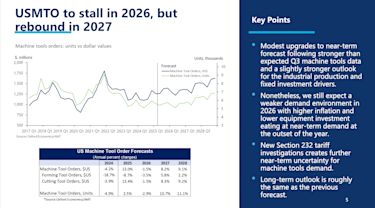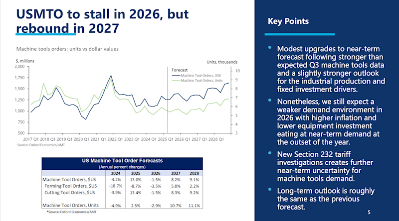 Sean Metcalfe of Oxford Economics stated that global industrial output is projected to grow 2.7% in 2025, but slow to 1.9% in 2026, reflecting front-loaded production and tariff-related uncertainty. The machine tool sector showed resilience in early 2025 in the face of trade disruption and will finish the year in positive territory, but the industry is expected to contract slightly in 2026 before rebounding with 8.2% growth in 2027. Data from the U.S. Manufacturing Technology Orders Report by AMT buttresses this view, with YTD orders through September 2025 up 17.3% over the same period in 2024.
