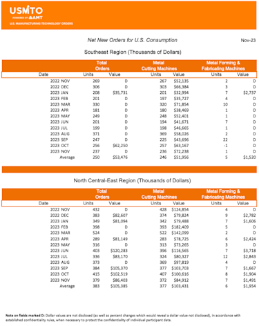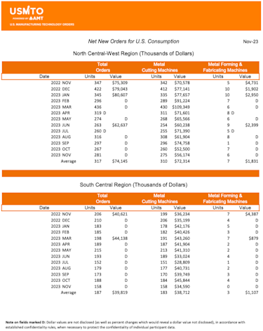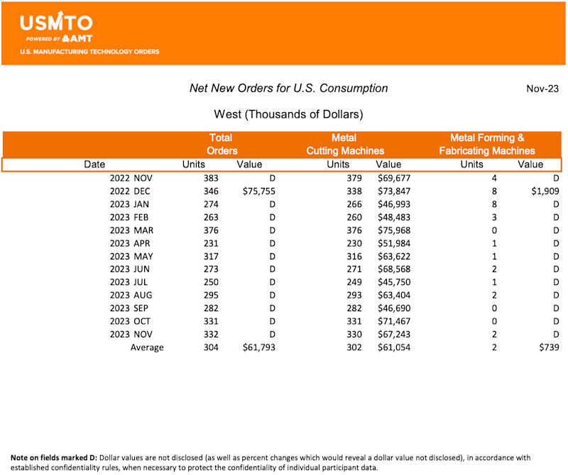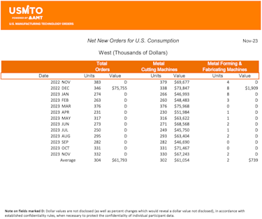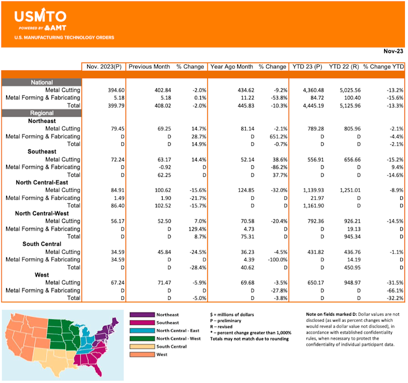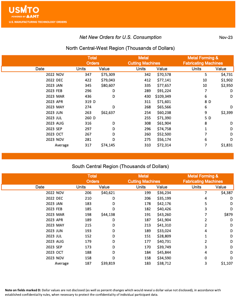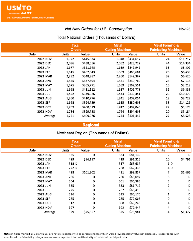 The United States Manufacturing Technology Orders (USMTO) Report is based on the totals of actual data reported by companies participating in the USMTO program. This report, compiled by AMT – The Association For Manufacturing Technology, provides regional and national U.S. orders data of domestic and imported machine tools and related equipment. Analysis of manufacturing technology orders provides a reliable leading economic indicator as manufacturing industries invest in capital metalworking equipment to increase capacity and improve productivity.