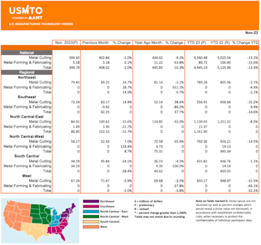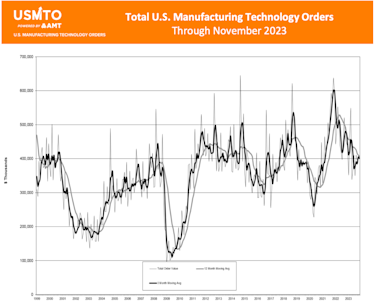 McLean, Va. (January 9, 2024) — The soft landing the U.S. economy generally experienced through 2023 did not affect all sectors of the economy evenly. Even in the face of improving economic health, orders of manufacturing technology, measured by the U.S. Manufacturing Technology Orders Report published by AMT – The Association For Manufacturing Technology, consistently fell short of orders placed in 2022. November 2023 was no different, with orders falling to $399.8 million, 10.3% lower than those placed in November 2022 and 2% behind orders placed in October 2023. Year-to-date orders reached $4.45 billion in 2023, 13.3% below the same period in 2022.
