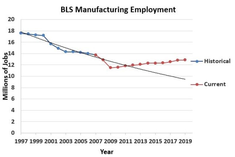The historically strong surge in manufacturing employment for the last decade reflects the impact of a slowing rate of offshoring and a rapidly growing rate of reshoring and FDI. December 31, 2019, employment is about 3.2 million higher than would have been forecast in 2006 before the Great Recession (Figure 3).