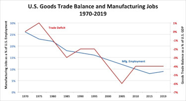 The loss of about six million jobs is primarily due to the trade deficit and offshoring. A relatively small percentage is due to increases in productivity, which has only grown about 0.4% per year from 2007 to 2019. The strong correlation of trade deficit and declining manufacturing employment is clear in Exhibit 6.