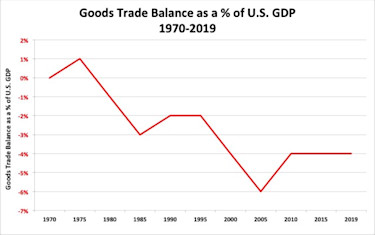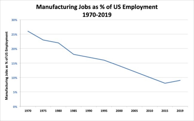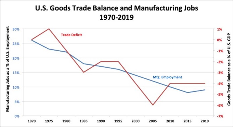 According to the Economic Policy Institute, the U.S. trade deficit with China alone cost 3.7 million American jobs between 2001 and 2018. The United States has gone from being the world’s manufacturing powerhouse, responsible for the lion’s share of global industrial production just after WWII, to being unable to produce critical Personal Protection Equipment (PPE) for the COVID-19 crisis in a timely manner.