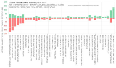 The trade deficit is not uniform across all product categories. The United States is relatively strong in a few legacy high-tech, heavy industry categories, such as airplanes, defense, construction equipment, and jet engines (Exhibit 7). Otherwise, our profile is akin to a developing country with strong surpluses of commodities at the right of the chart and trade deficits in high-tech goods, such as computers and smart phones, on the left. The green bars are exports, the red are imports. Units are $ billions.