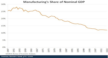 Manufacturing’s share of GDP collapsed from about 27% around 1955 to about 12% today (Exhibit 2).