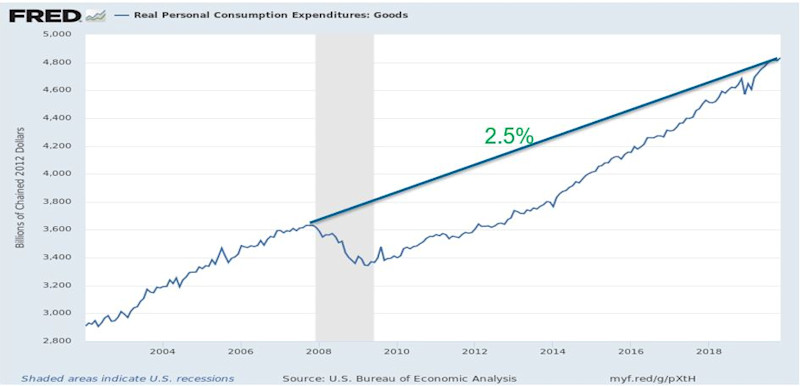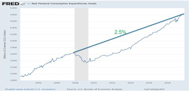 Differing perspectives might propose that a shrinking manufacturing share is due to our post-industrial society and that we mainly consume services rather than goods. However, this concept is dispelled in Exhibit 3, which illustrates that United States goods consumption has grown at least as fast as the GDP (Exhibit 3).