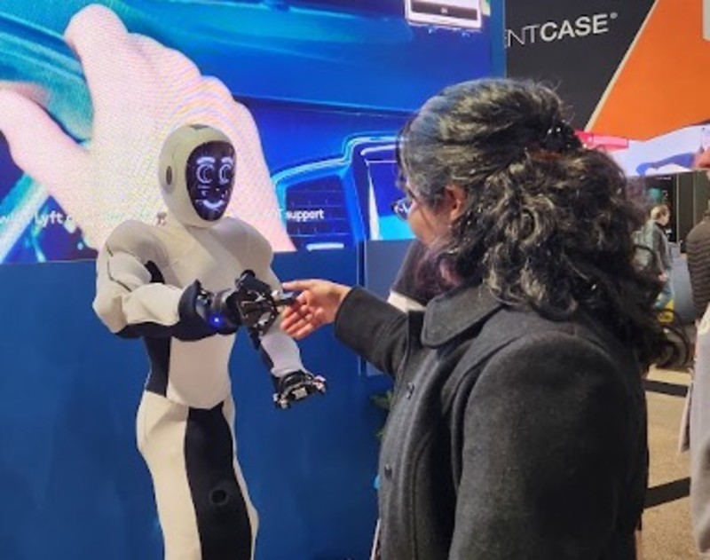 Eve from Halodi Robotics shakes hands at CES 2023 with Karinne Ramirez-Amaro, associate professor at Chalmers University of Technology and head of IEEE Robotics and Automation Society’s Women in Engineering chapter. (Image source: Andra Keay)
