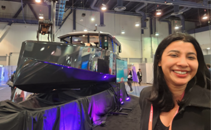 Navier’s ‘boat of the future’ with founder Sampriti Battacharya, plus an extra stowaway quadruped robot from Unitree. Image source: Andra Keay