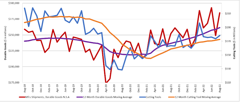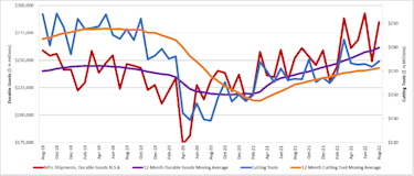 The graph below includes the 12-month moving average for the durable goods shipments and cutting tool orders. These values are calculated by taking the average of the most recent 12 months and plotting them over time.