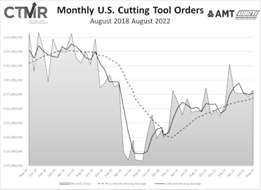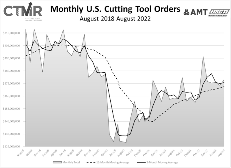 McLean, Va. (October 18, 2022) – August 2022 U.S. cutting tool consumption totaled $178.1 million, according to the U.S. Cutting Tool Institute (USCTI) and AMT – The Association For Manufacturing Technology. This total, as reported by companies participating in the Cutting Tool Market Report collaboration, was up 2.6% from July’s $173.5 million and up 8.9% when compared with the $163.5 million reported for August 2021. With a year-to-date total of $1.4 billion, 2022 is up 7.9% when compared to the same time period in 2021.