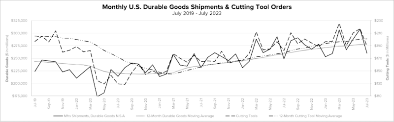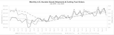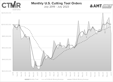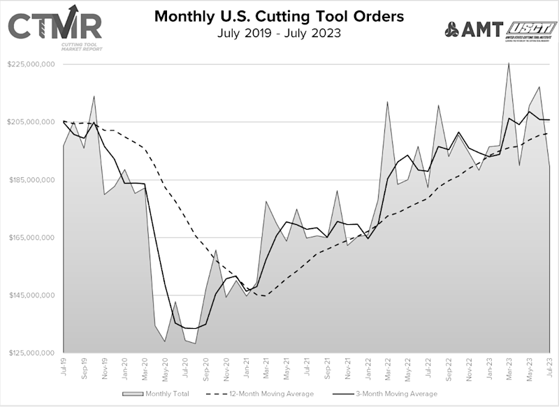 “July is typically a slow month due to plant shutdowns and employee vacations. This year was no exception,” commented Jack Burley, chairman of AMT’s Cutting Tool Product Group. He further expanded, “Cutting tool consumption remains at a consistent level despite the news of declining activity in manufacturing. Automotive sales in 2023 have rebounded now that the supply chain issues have been mostly resolved. However, the recent labor dispute is likely to disrupt production for not only the big three but also for all supply chain partners, which may affect cutting tool usage later this year if it isn’t resolved quickly.”