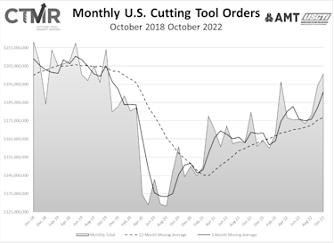McLean, Va. (December 15, 2022) – October 2022 U.S. cutting tool consumption totaled $200.6 million, according to the U.S. Cutting Tool Institute (USCTI) and AMT – The Association For Manufacturing Technology. This total, as reported by companies participating in the Cutting Tool Market Report collaboration, was up 3.4% from September’s $194.0 million and up 11.7% when compared with the $179.6 million reported for October 2021. This has been the highest monthly total since October 2019. With a year-to-date total of $1.8 billion, 2022 is up 9.4% when compared to the same time period in 2021.